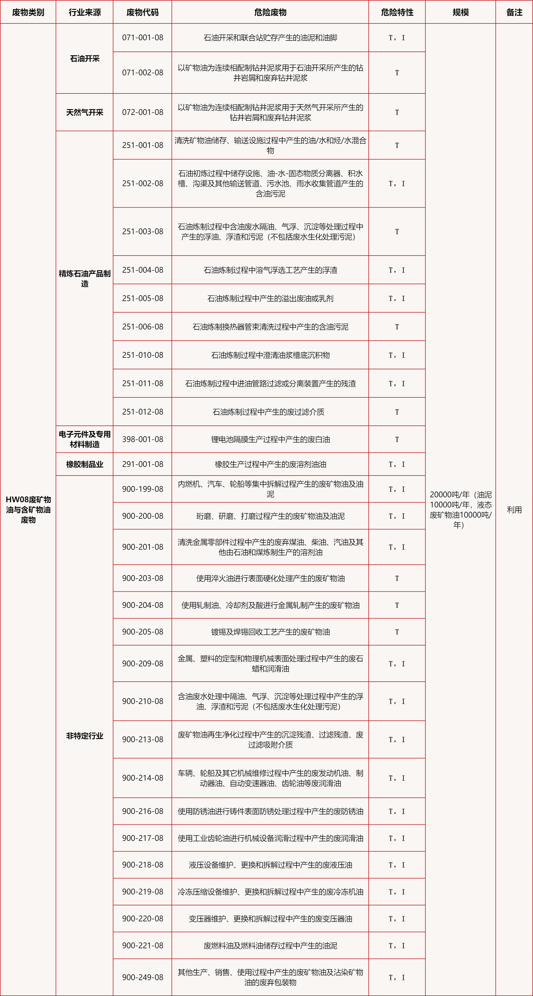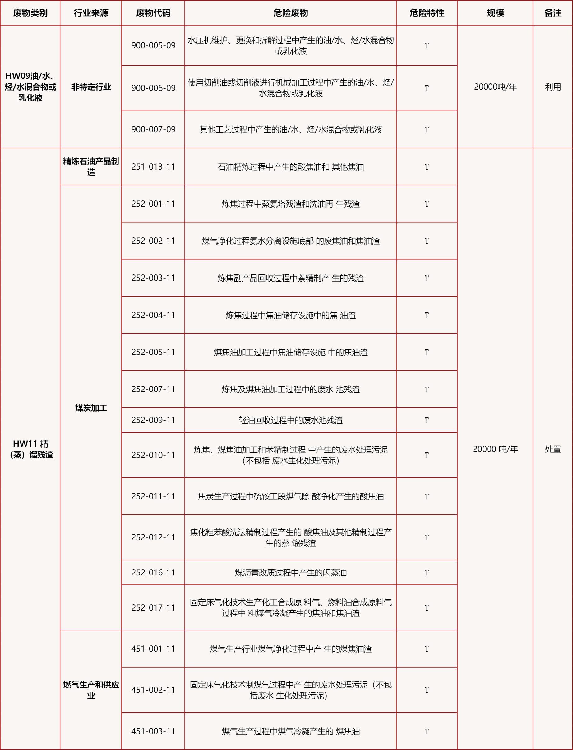 危废收集、贮存、利用HW08废矿物油20000吨/年、HW09油水混合物或废乳化液20000吨/年、 HW11煤焦油20000吨/年